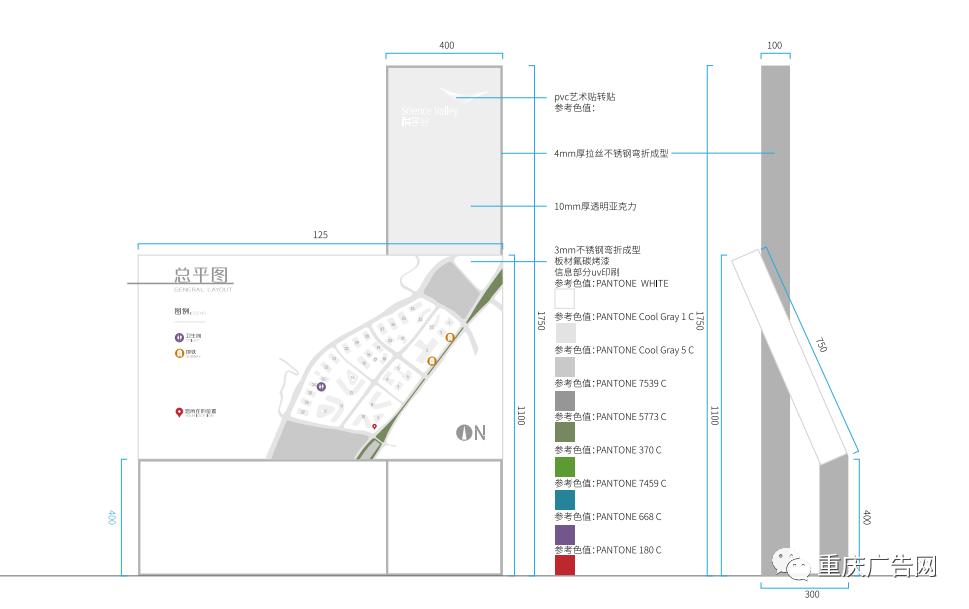总平面图主要采用拉丝不锈钢本色折弯成型,总平面图采用UV印刷,透明部分采用透明亚克力加不锈钢边框制作。