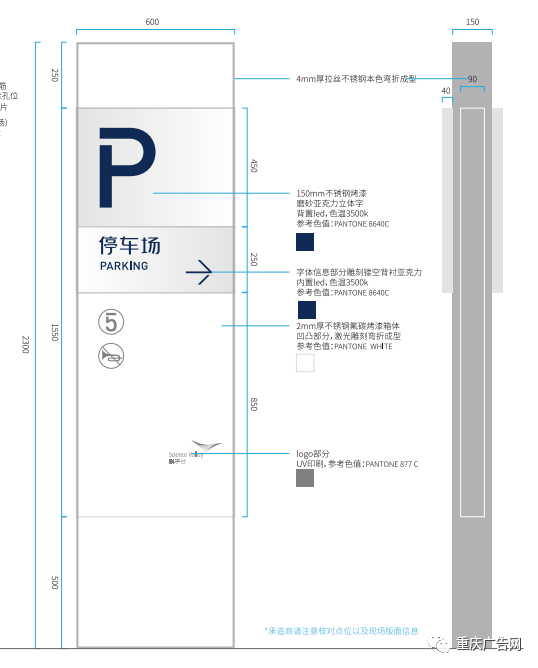 导视牌主要采用拉丝不锈钢本色折弯成型,发光字体采用不锈钢镂空发光,背贴亚克力,logo部分采用UV印刷。